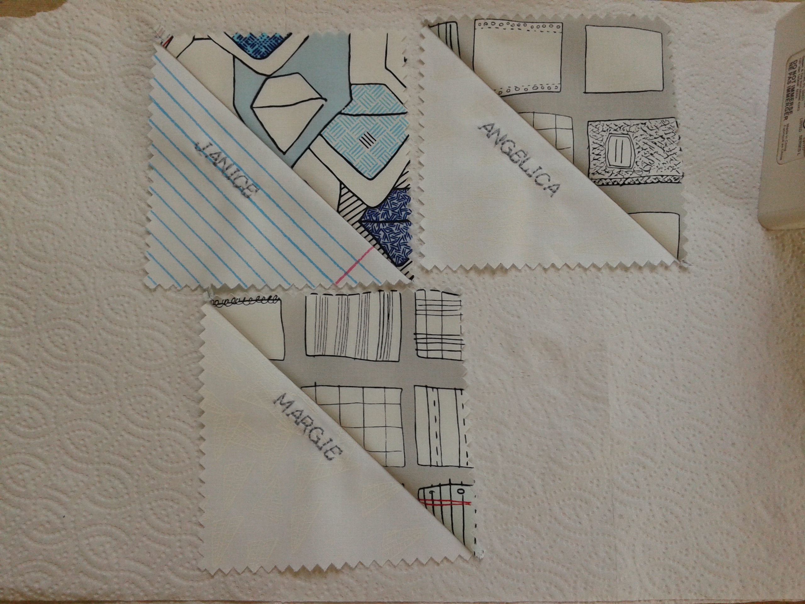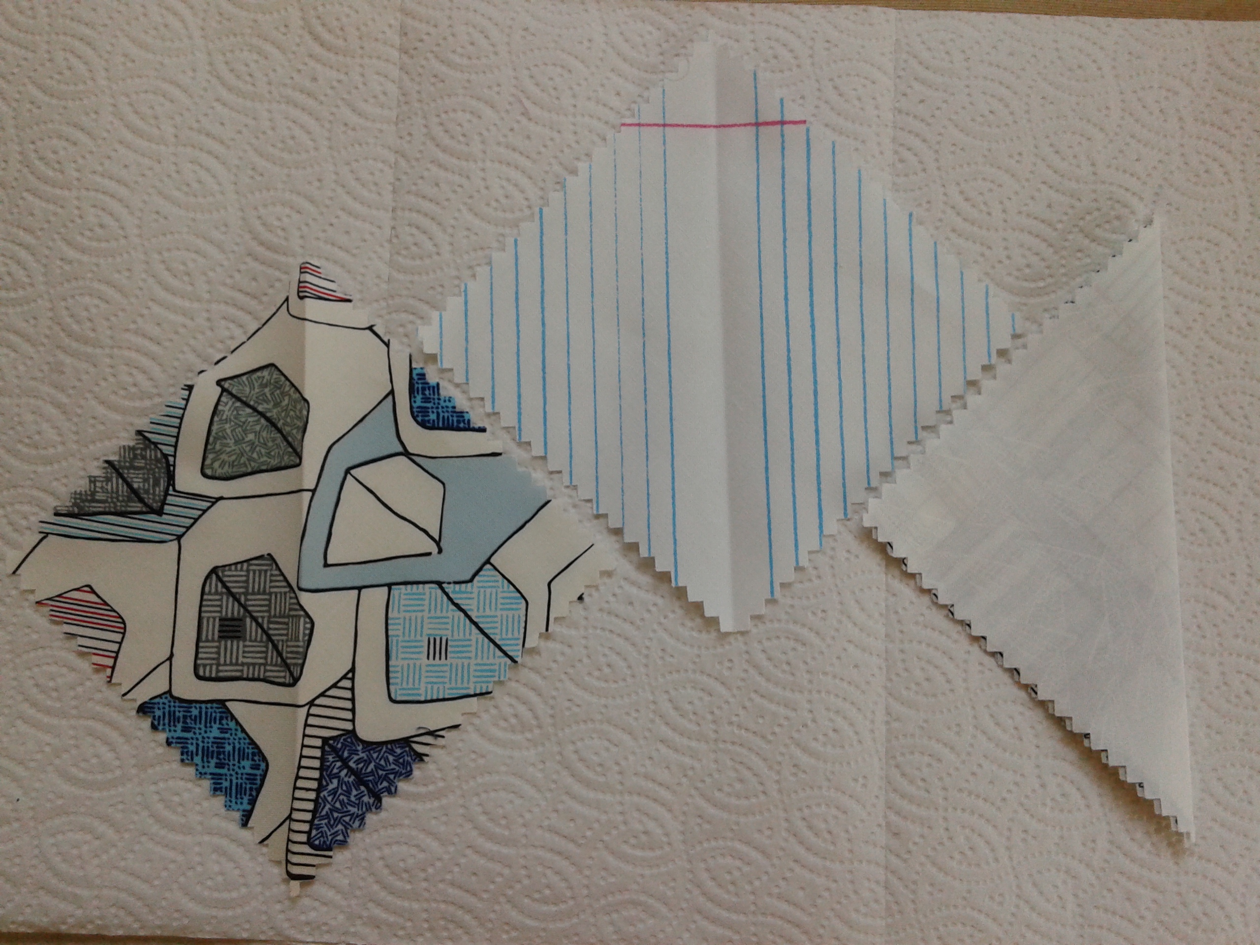 These charms made the cut. I placed the top/showy side facing together/back side facing out, lined them up and ironed them. Then fold them over to form a triangle and ironed to make a crease. A light pencil/chalk line or score line down the center point to point would work as well. Because some of the charms are light I decided to iron in the crease.