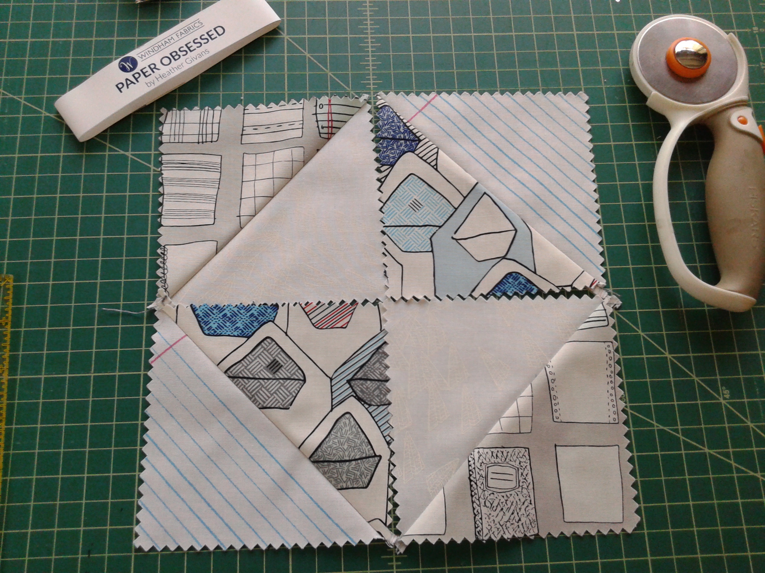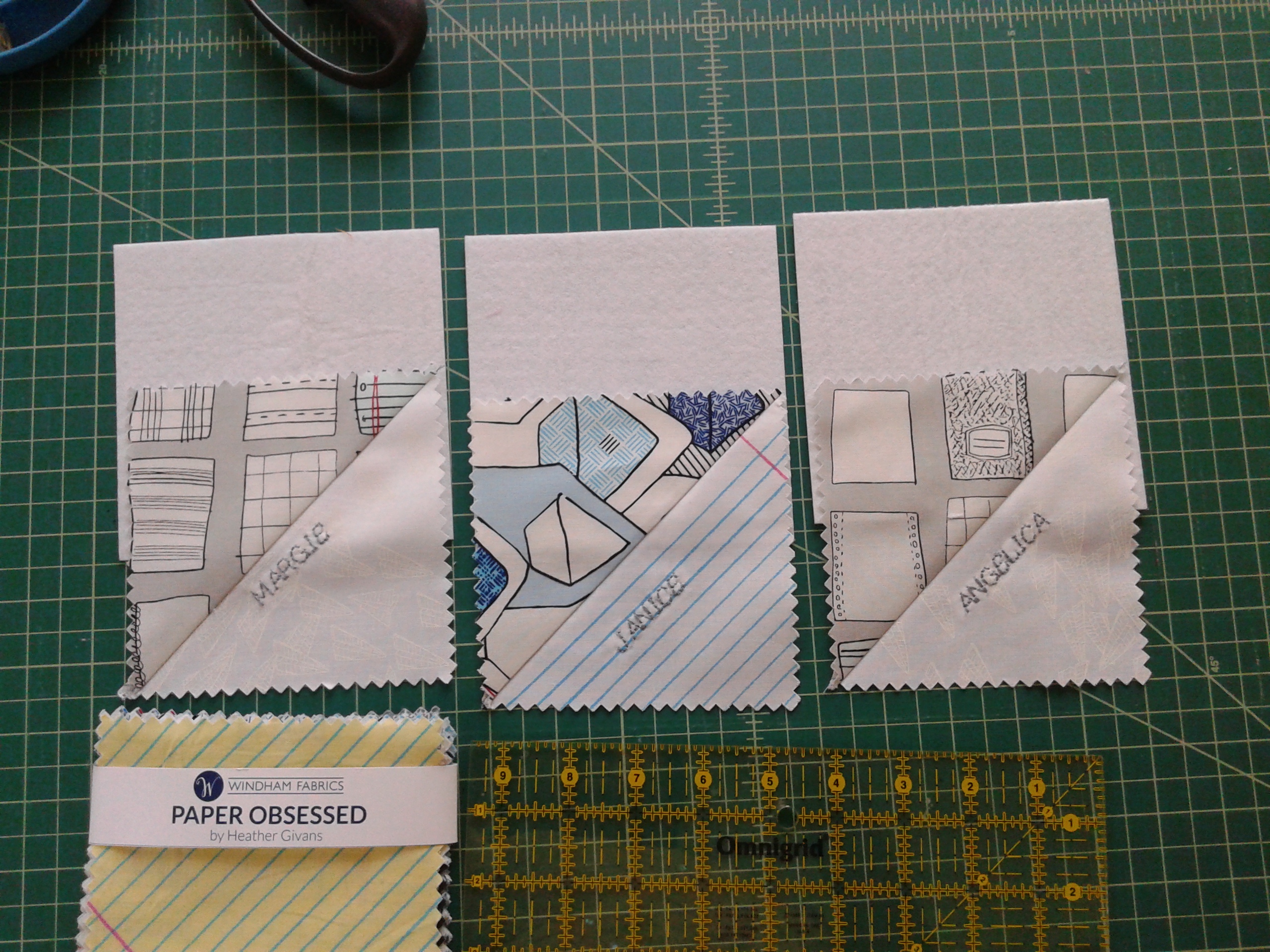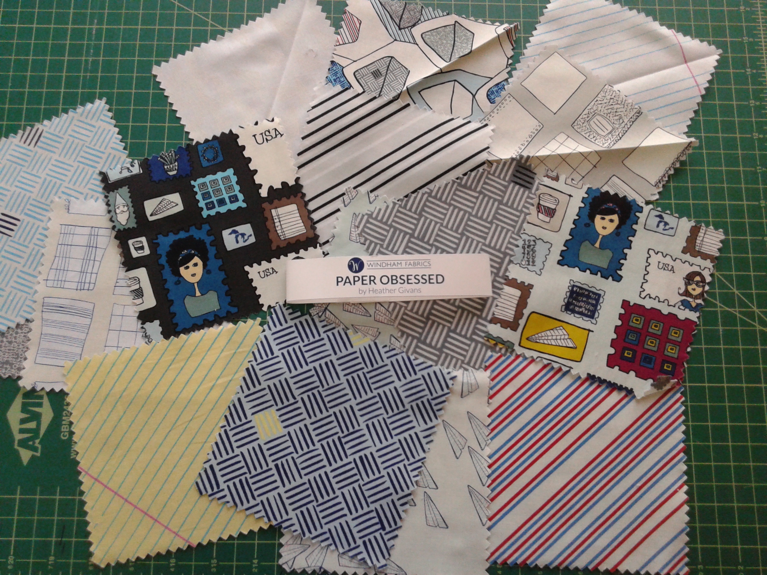 I started looking in my stash and that lead me to finally check out my QuiltCon goodie bag I received a few months ago. Looking through it I stumbled upon a charm pack called PAPER OBSESSED by fiber artist Heather Givans for Windham Fabrics. I cracked the cigar band and started giggling as I took a look at all the fun “paper” themed 5 inch charm squares. Ā There were notebooks, paper airplanes and yellow legal paper and envelopes. All sorts of paper related motifs. The gig I did was for a school so I thought this charm pack would definitely fit the bill.