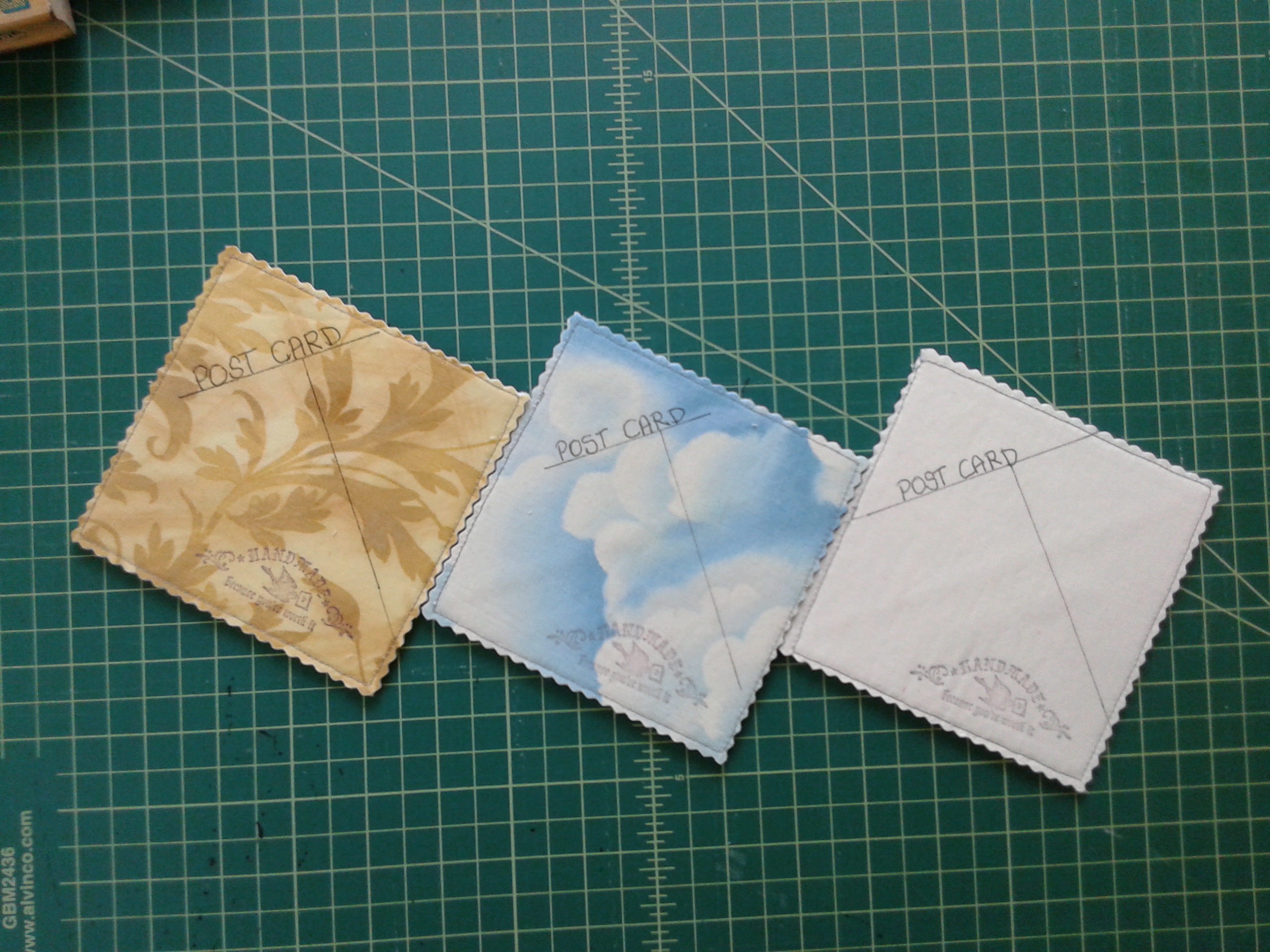 This is the backs of the fabric postcards. I used some rubber stamps and wrote Postcard in the area I deemed to be the top. Check USPS regulations for directions on how a postcard should be labeled.