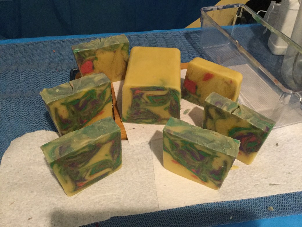 After a 2 day sapononap here is the cut. Cindy cut some bars with the ripple cutter and some without. The soap is scented with lemon, grapefruit and basil essential oils. Colored with turmeric and cocoa powder. The addition of goat’s milk yogurt cocoa butter and a bit of cumin (black seed oil)to the batter make this soap a luxurious decadent body treat. She has put them up to cure out for the next four weeks.
