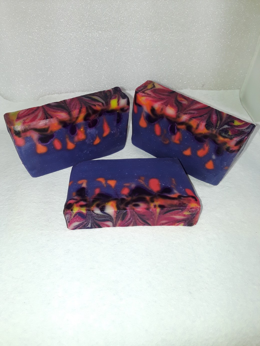 The colors remind me of fire balls raining from dark skies. So I’ve named this soap Fiery Night Skies.